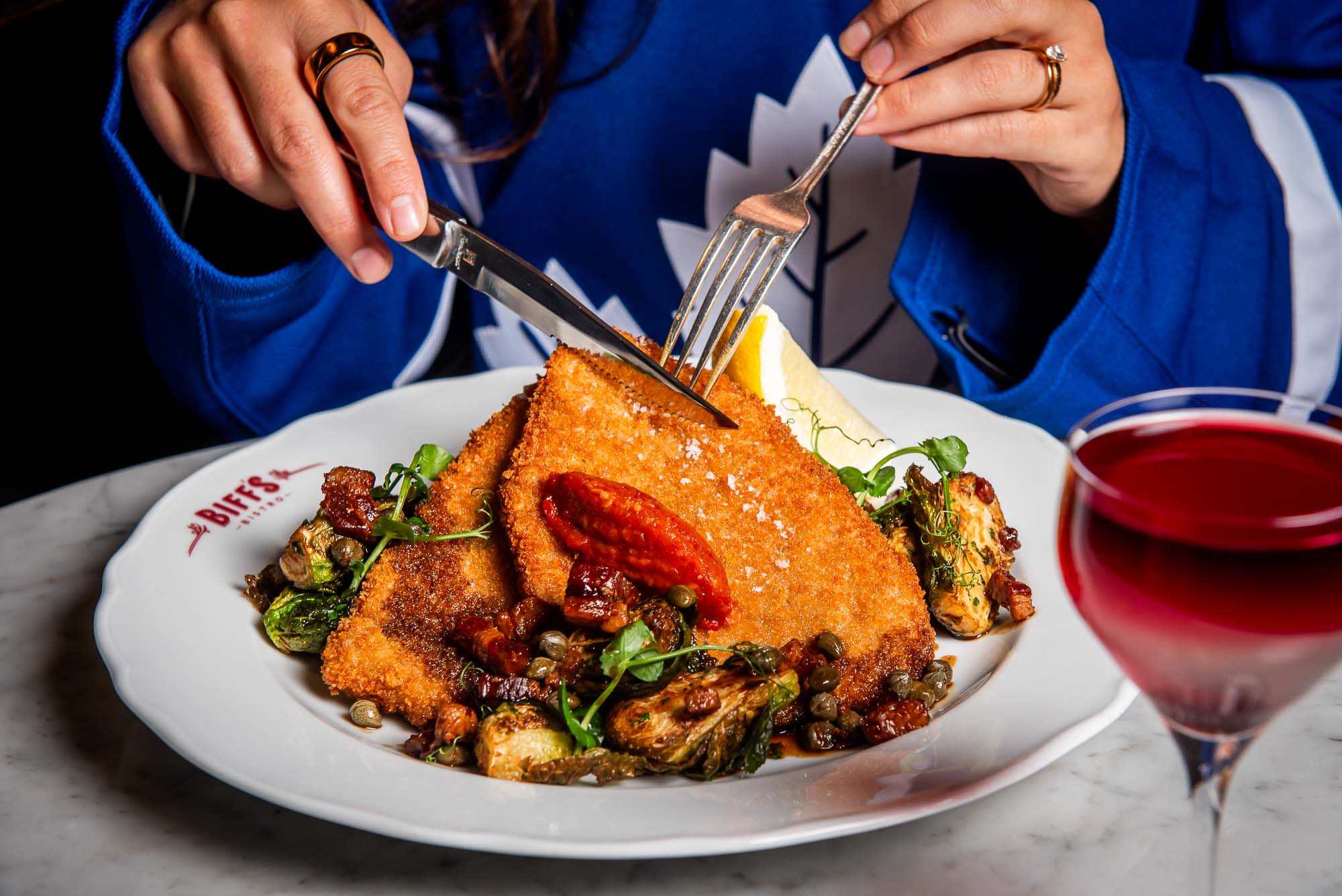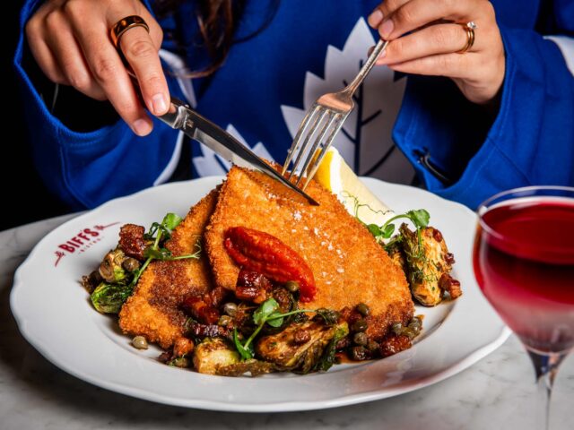 Settle in with elevated game-day fare like our Veal Schnitzel with pomme purée, bacon–caper jus and fried Brussels sprouts, or go big with the Côte de Bœuf Dinner for Two, complete with a 24oz ribeye steak, Caesar salad, fresh-cut fries, roasted mushrooms, green beans, hollandaise and jus.